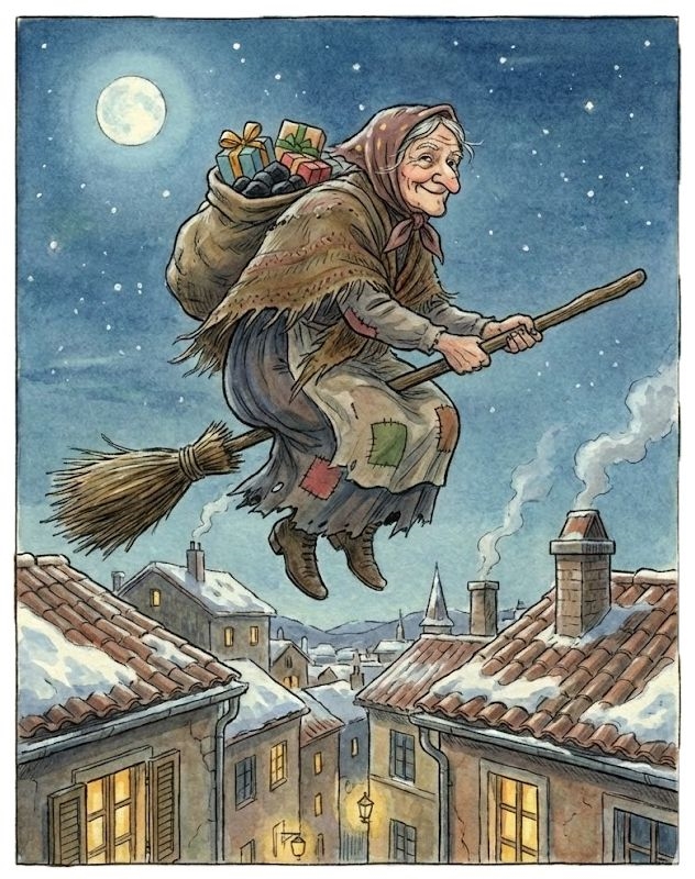 Itálie má sice Babbo Nataleho, ale starší tradice byla jediná evropská nadělovačka ženského pohlaví: stará a ošklivá čarodějnice La Befana. Nosívala šátek a lítala na koštěti, na nose měla bradavici, ale měla dobré srdce a v noci na Tři krále (tedy z 5. na 6. ledna) roznášela do italských domácností dárky. Do fuseklí. Někde se v Itálii naděluje i nadvakrát: velice na Vánoce a skromnějí s Befanou.
