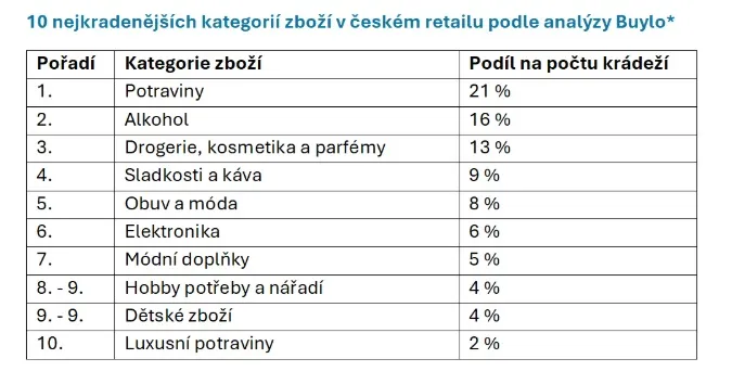 Krádeží v českých obchodech přibývá. Nejvíc se kradou potraviny, ty tvoří třetinu všeho, co lidé na prodejně odcizí. Druhým nejčastějším artiklem je alkohol, a to téměř v každém šestém případě. Zloději vyhledávají také drogerii, kosmetiku a parfémy (13 % všech případů krádeží v obchodech) nebo obuv a módu (8 %). Vyplývá to z aktuálního průzkumu technologického startupu Byulo mezi víc než 500 respondenty.