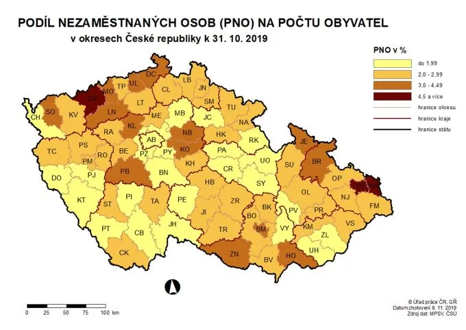 Nejvyšší podíl nezaměstnaných teď mají okresy Karviná (6,4 %), Ostrava-město (4,9 %), Chomutov (4,8 %), Bruntál (4,5 %), Most (4,4 %), Louny (4,1 %), Znojmo (4 %), Ústí nad Labem a Hodonín (oba 3,8 %). Naopak nejnižší nezaměstnanost hlásí Praha – východ (1,1 %), Rychnov nad Kněžnou, Pelhřimov a Jindřichův Hradec (shodně 1, 3 %), Praha – západ, (1,4 %), Písek, Prachatice a Benešov (shodně 1,5 %).