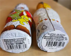 „Mikuláš obsahuje jen devět procent kakaového prášku se sníženým obsahem tuku, takže nesmí nést název čokoláda. Ve výčtu jeho složení najdeme na prvních místech cukr, plně ztužený rostlinný tuk z palmových jader, sušenou mléčnou syrovátku a až pak zmíněný kakaový prášek. Figurka Anděla z pravé čokolády oproti tomu obsahuje nejméně 32 procent kakaové sušiny a je správně označena jako mléčná čokoláda. Na prvních místech ve složení najdeme cukr, kakaové máslo, kakaovou hmotu a sušené odstředěné mléko,“ říká Hoffmannová.