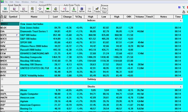 Po otevření programu OptionVue se objeví základní okno. Tady sledujeme informace o akciích, indikátorech, futures, komoditách, měnách a opcích.