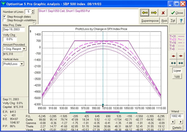 Grafická analýza se provede na základě údajů zadaných do Matrix, znázorňuje potenciální zisk a ztrátu. Několik časových čar znázorňuje, jak se teoreticky bude obchod chovat mezi současností a koncem platnosti opcí. Jsou zde také informace o nulovém bodu, pravděpodobnosti zisku, očekávané návratnosti obchodu, shrnutí řeckých písmen pro kterýkoliv vybraný den a cenu podkladového aktiva. Standardní deviace jsou zobrazeny dole vodorovnými čarami a mají stejné barvy jako v Matrix.