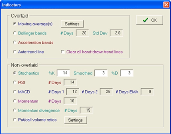 Součástí opčního software je i možnost provádět technickou analýzu přímo v OptionVue. Umožní to přípravu opčních obchodů na základě technické analýzy na „jednom místě“. Na displeji můžeme zobrazit také objem obchodů v dolarech, open interest pro puts, calls, nebo jejich poměr (puts/calls).