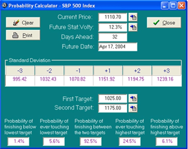 OptionVue má hodně funkcí pro statistické výpočty pravděpodobnosti a pro očekávanou výkonnost. Kalkulátor pravděpodobnosti je hodně užitečný pomocník. Určuje statistickou pravděpodobnost cenové změny pro časové období, které zadal uživatel a statistickou úroveň volatility.