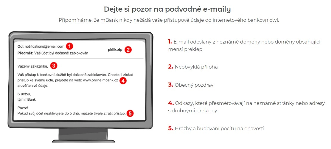 mBank proto připomíná pět zásad obezřetnosti při práci s e-maily: