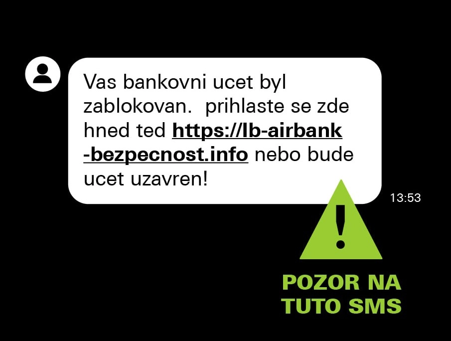 Banky varují před novou vlnou podvodných SMS. „Podvodníci teď ve velkém rozesílají lidem SMSky a pod výhružkou zrušení účtu je navádějí k přihlášení do falešného internetového bankovnictví. Nevědí přitom, kdo má jakou banku. Prostě to náhodně zkouší,“ píše například Air Bank a připomíná: Skutečné banky v SMS ani e-mailu nikdy neposílají odkaz na přihlášení.