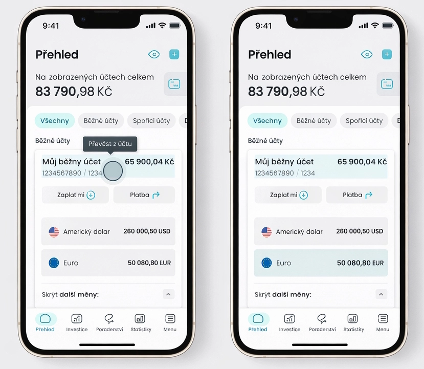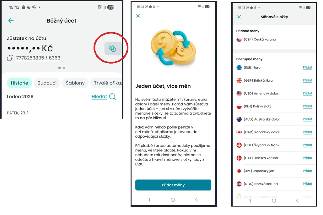 Při platbě v cizí měně (pokud k ní vedete multiměnovou složku) se částka automaticky odečte z příslušné složky – jak při převodu z účtu, tak při platbě kartou. Pokud na složce v této měně není dost peněz, odečte se zbytek z korunové nebo jiné složky.