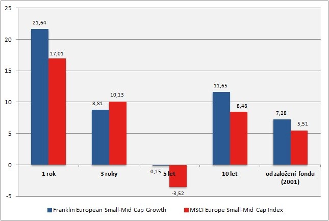 Závěrem jedna výhoda, ze které mohou investoři profitovat. Menší společnosti se ve srovnání s velkými pohybují na mnohem méně efektivním trhu. Akcioví analytici se do průzkumu takových firem příliš nehrnou, a tak o nich mají investoři oproti velkým firmám o poznání méně informací. Nedostatečný výzkum může vést k cenovým anomáliím, které můžou ve svůj prospěch využít aktivní manažeři fondů. Jeden takový aktivně spravovaný fond podrobíme detailnější analýze: Franklin European Small-Mid Cap Growth (ISIN: LU0138075311 [třída A acc, EUR]).