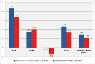 Fond si ve srovnání s benchmarkem i konkurenčními fondy (více než sto fondů v kategorii Europe Small Cap agentury Morningstar) vede velmi dobře. Roční výnos (p.a.) na desetiletém horizontu činí 11,65 procenta, zatímco index si připsal necelých 8,5 procenta ročně. Manažerům se navíc podařilo dosáhnout nižší volatility. Standardní odchylka na pětiletém horizontu na úrovni 17,8 procent je přibližně o čtyři procentní body nižší než odchylka benchmarku.