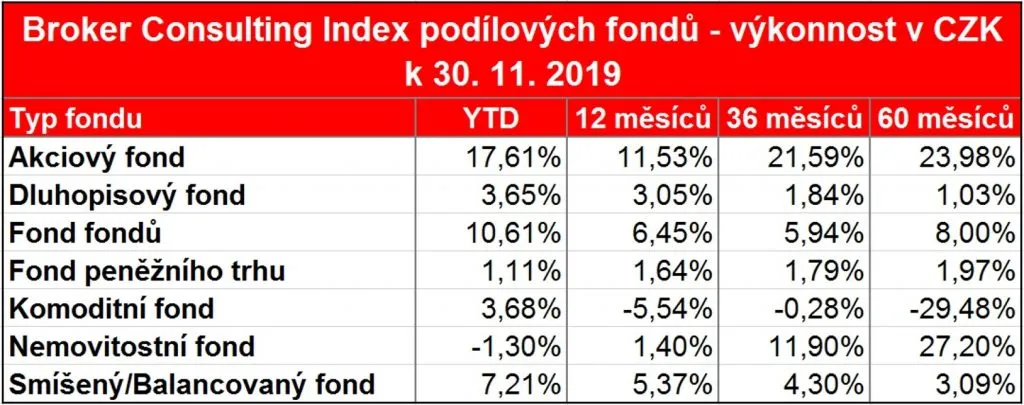 Akciovým fondům se letos daří. Od začátku roku do konce listopadu dosáhly průměrného zhodnocení 17,61 %. Vyplývá to z dat za celý trh, na jejichž základě sestavuje společnost Broker Consulting svůj Index podílových fondů.