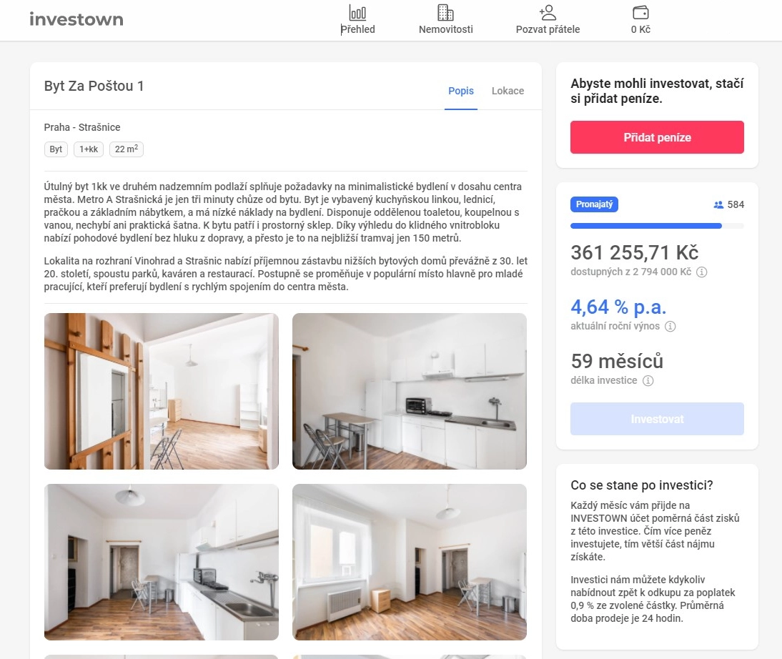 Investiční služba Investown zahájila ostrý provoz. Zájemci zatím mohou investovat do dvou pražských bytů. První slibuje aktuální roční výnos 4,2 %, druhý 4,64 %. Lidé už do nich investovali přes 85 % vybírané sumy.