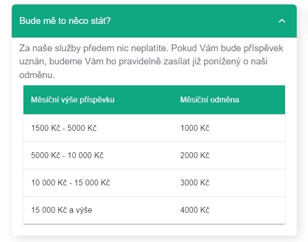 Přesto se na internetu a na sociálních sítích objevila nabídka pomoci s podáním žádosti za úplatu. A ne zrovna zanedbatelnou. Stránka DostupnýPříspěvek.cz avizovala, že po kladném vyřízení žádosti si vezme odměnu 1000 až 4000 korun – podle výše přiznaného příspěvku. Ne jednorázově, ale každý měsíc. To vše za to, že převezme dokumenty a vybavena plnou mocí zažádá o příspěvek.