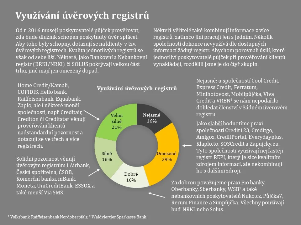 Od roku 2016 musejí poskytovatelé půjček prověřovat, zda bude dlužník dokáže poskytnutý úvěr splácet. Aby toho byly schopny, dotazují se na klienty v takzvaných úvěrových registrech. Kvalita jednotlivých registrů se však od sebe liší.