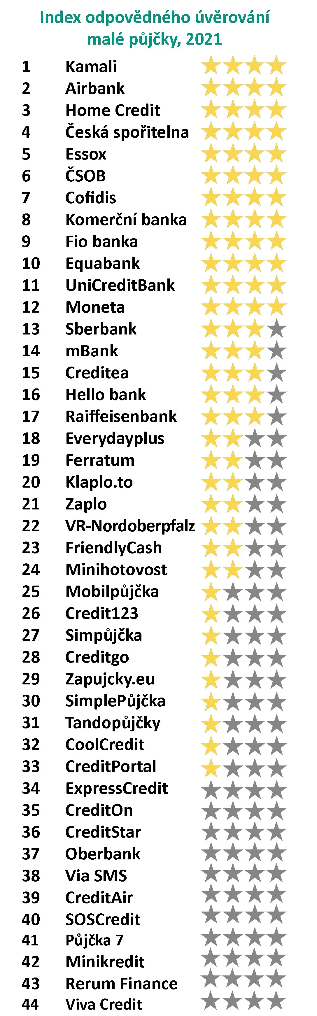 Aktuální žebříček porovnává 44 společností. Půjčky zkoumá pomocí 15 různých parametrů, které zahrnují náklady (kolik lidé za úvěr zaplatí a co je bude stát případné zpoždění se splácením), transparentnost (rozsah a přehlednost poskytovaných informací) a klientskou vstřícnost (posouzení praxí věřitelů před a po poskytnutí půjčky).