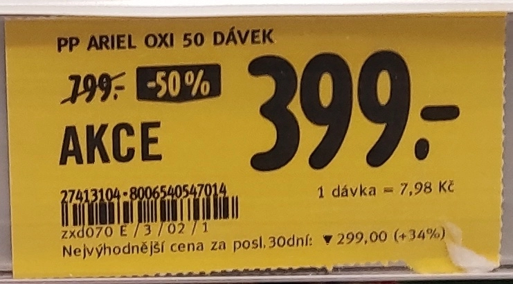 Jen extrémně pozorný spotřebitel se podle soudu nenechá zmást nejvýraznějšími údaji a dostane se i k dalším údajům, prodejcem schválně graficky upozaděným. Jenže: i za slovy „nejvýhodnější cena za posl.30dní“ Albert umístil černý trojúhelník směřující svým hrotem dolů, který má opět vyvolat dojem snížení ceny. Teprve při podrobném zkoumání se spotřebitel dostane k poslednímu údaji, že aktuální cena je o šest procent vyšší.