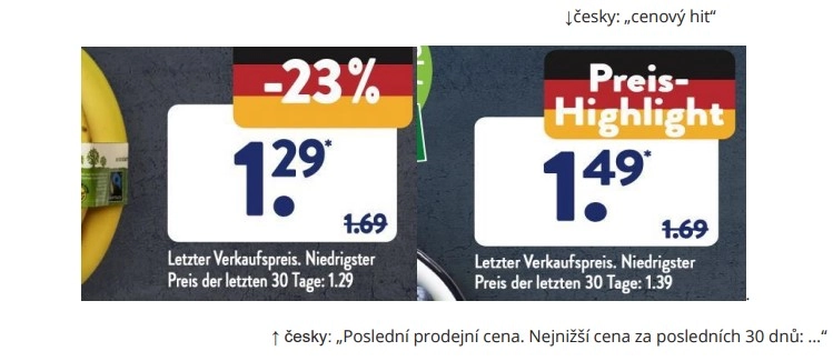 Soudní dvůr EU tak odmítl praxi řetězce Aldi, který výši slevy počítal z ceny bezprostředně předcházející akční nabídce, zatímco nejnižší cenu za posledních třicet dnů uvedl méně výrazným písmem jako poslední informaci.