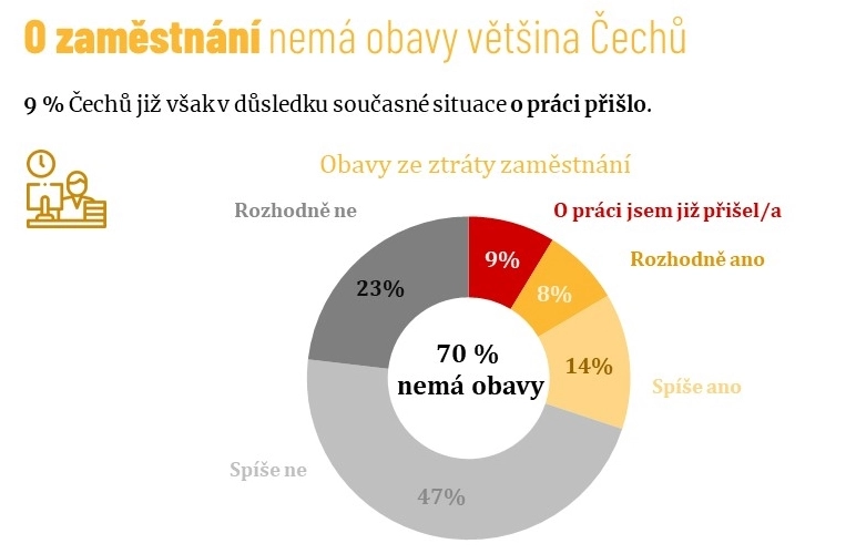 Ztráty zaměstnání v důsledku dlouhodobých lockdownů a dopadů pandemie se aktuálně neobává 70 % Čechů, zatímco před rokem to bylo 78 %. Devět procent lidí v důsledku pandemie už o práci přišlo.