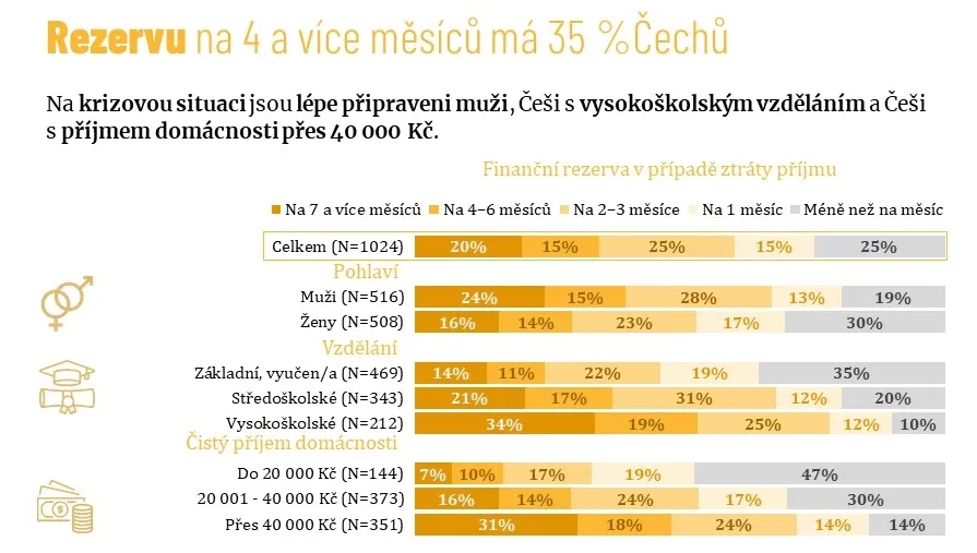 Na krizovou situaci jsou lépe připraveni muži, lidé s vysokoškolským vzděláním a domácnosti s měsíčním příjmem přes 40 tisíc korun. Podrobnější čísla ukazuje následující graf.