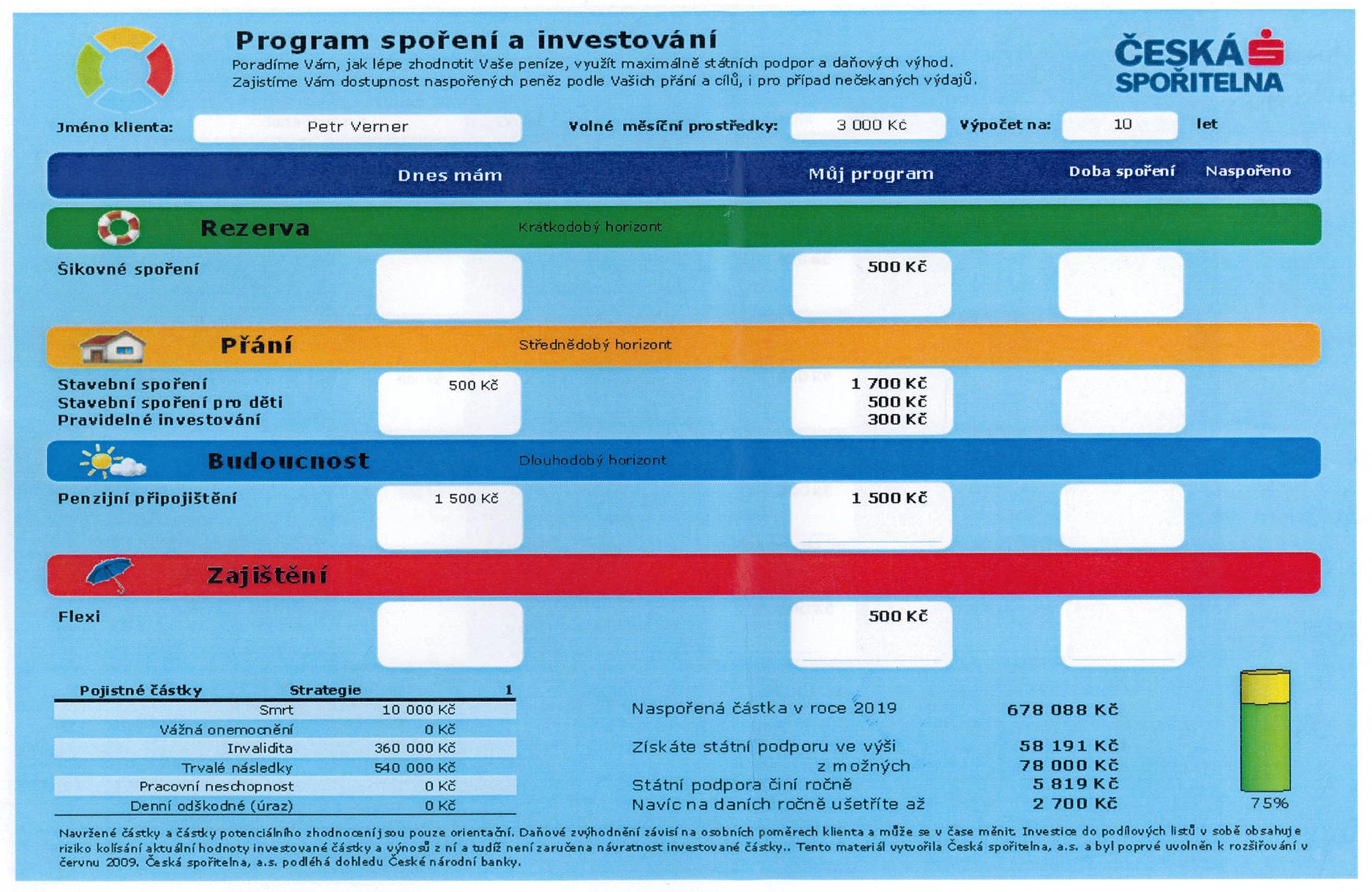 Jakmile se poradce shodne s klientem na měsíční volné částce a do tabulky vepíše již existující produkty, klient může okamžitě vidět, na kolik procent čerpá státní podporu. K dispozici má sloupcový graf i tabulku. Jestliže klient nečerpá maximum státních příspěvků, které lze získat ze stavebního spořenía penzijního připojištění, poradce ho na tuto skutečnost upozorní. Navrhne mu zvýšení měsíční úložky tam, kde je příliš nízká, nebo mu doporučí sjednání chybějícího státem podporovaného produktu. Vždy se ale má jednat pouze o doporučení a je jen na klientovi, zda se pro zvýšení spořených částek či nový produkt rozhodne, upřesňuje ředitel pro rozvoj obchodu České spořitelny Martin Techman.