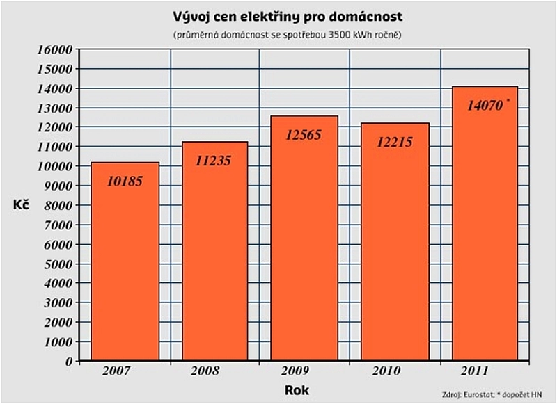 Dostat se k přehledu regulovaných cen energie není jednoduché. Mimochodem ve výroční zprávě Energetického regulačního úřadu za rok 2011 se slovo „cena“ vůbec nevyskytuje, přestože to je klíčová položka, která lidi zajímá. Vystačíme tedy s grafem Hospodářských novin, který nám alespoň ilustruje cenu elektřiny pro domácnosti.