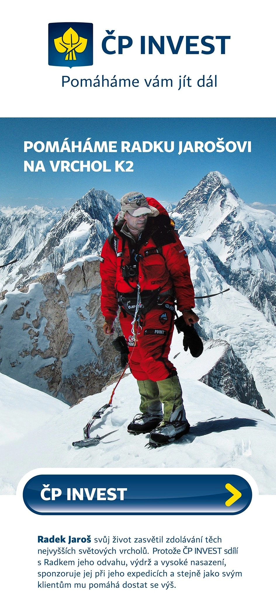 Jasně, že taková snaha je. ČP INVEST má navíc ta nejdůležitější místa na mé výstroji. Je jim ale jasné, že ne vždy se to může, třeba s ohledem na počasí, podařit. Je to přece jen trochu těžší, než si někde objednat banner. (smích) Všechno funguje na důvěře mezi mnou a sponzorem.
