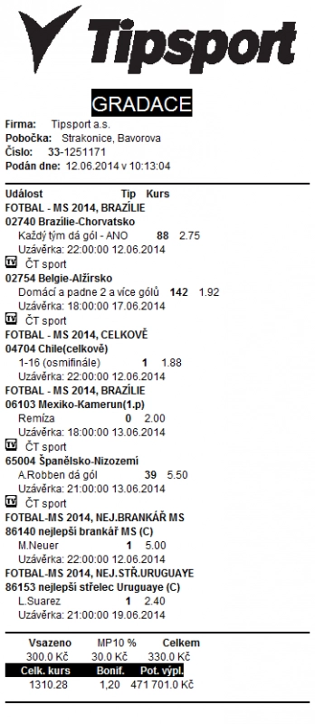 Mezi českými sázejícími byl o mistrovství světa ve fotbale obrovský zájem. A nic na tom nezměnil ani fakt, že v Brazílii chyběl Tomáš Rosický a jeho kolegové z národního týmu. Sázkové kanceláře shodně hlásí rekordní obraty. Jen ve třech největších společnostech – Fortuna, Tipsport a Chance – se dohromady na zápasy mistrovství prosázelo přes 1,3 miliardy korun. Pokud jde o sázky, brazilský šampionát hravě překonal nejen všechny důležité sportovní události letošního roku, jako třeba zimní olympiádu v Soči, hokejové mistrovství světa nebo tenisový Wimbledon, ale stal se dokonce i „nejsázenějším“ turnajem v historii.