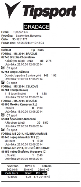Propadák Italů, Angličanů a především obhájců titulu ze Španělska znamenal pro sázkové kanceláře žně. Bookmakeři si totiž vždy spokojeně mnou ruce, když se papírovým favoritům nedaří. Tragické výsledky evropských týmů nabitých hvězdami nakonec zazdily statisíce tiketů a sázkaři se mohli jen drbat za uchem. Na letošní šampionát tak určitě nebude vzpomínat v dobrém tipér, který si u Tipsportu vsadil tři sta tisíc na to, že Španělsko porazí Chile a Nizozemsko zvítězí nad Austrálií alespoň o dvě branky. Ani jedna z příležitostí nevyšla a tak se peníze stěhovaly na účet sázkové kanceláře. U Fortuny zase stejnou sumu prohrál člověk, který v utkání Belgie versus Rusko spoléhal na vítězství sborné. A na ruskou reprezentaci bude jistě naštvaný i sázkař, který na tiket poskládal dvanáct zápasů s vyšším kurzem a vsazenou stovku tak mohl při stoprocentní úspěšnosti proměnit v rovný milion. Bohužel mu ale oslavy pokazila remíza Ruska s Alžírskem.