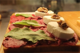 Vlastní kváskový chléb, červená řepa, kozí sýr