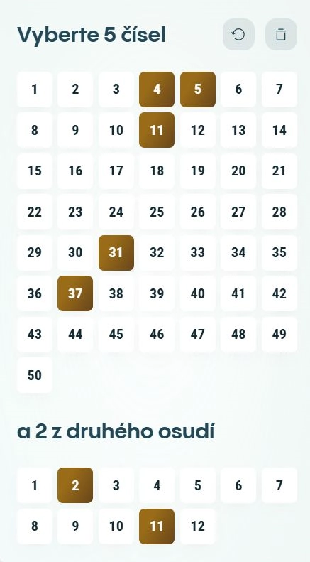 Zdroj: allwyn.czJeden sloupec Eurojackpotu. Sází se 5 čísel z 50 v prvním osudí a dvě „euročísla“ z druhého osudí. Celkem se na jednom tiketu dá vsadit 6 sloupců, jeden po šesedsáti korunách. Jak odoplněk můžete ještě vsadit další čísla v národním doplňku k Eurojackpotu, hře Extra 6.