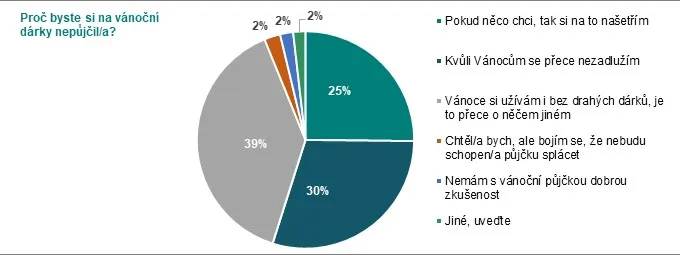 Většina lidí oslovených v průzkumu (92 %) se nicméně shoduje, že půjčka na Vánoce je špatný nápad. Víc než dvě třetiny lidí si na dárky rozhodně nepůjčí, a to zejména (39 %) proto, že Vánoce jsou o něčem jiném než o drahých dárcích. Neochota se zadlužit za vánoční dárky roste s věkem – určitě by si na vánoční dárky nepůjčilo 80 % ve věku nad 54 let.
