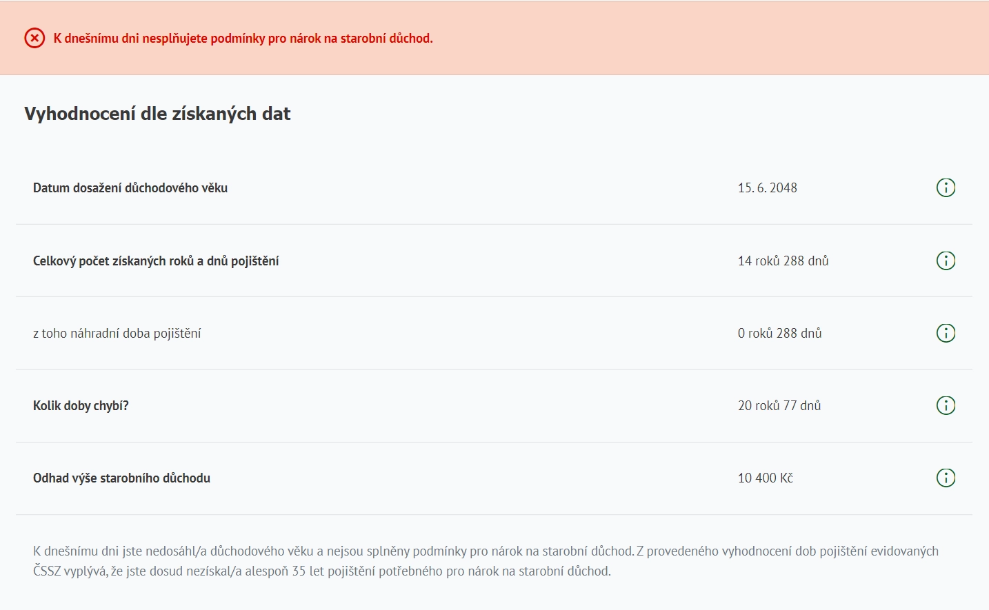 Po přihlášení okamžitě vidíte třeba to, jaký je váš termín odchodu do řádného starobního důchodu nebo jaká by nyní byla výše vašeho důchodu po započtení dosavadních příjmů.