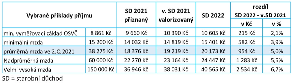 Například u lidí, kteří mají průměrný příjem, z něhož se bude důchod vypočítávat, na úrovni letošní minimální mzdy (15 200 korun), bude důchod přiznaný v roce 2022 o 582 korun vyšší, než valorizovaný důchod přiznaný v roce 2021. U průměrné mzdy je rozdíl už 954 korun.