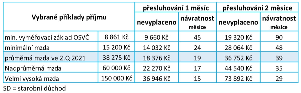 Návratnost lze jednoduše spočítat tak, že nevyplacenou částku důchodu 2021 vydělíme rozdílem mezi vyšším důchodem 2022 a valorizovaným důchodem 2021. Například u důchodu z roku 2021 ve výši 14 032 Kč při jednom měsíci přesluhování je to 14 032/582 = cca 24 měsíců, při dvou měsících přesluhování 28 064/582 = cca 48 měsíců.