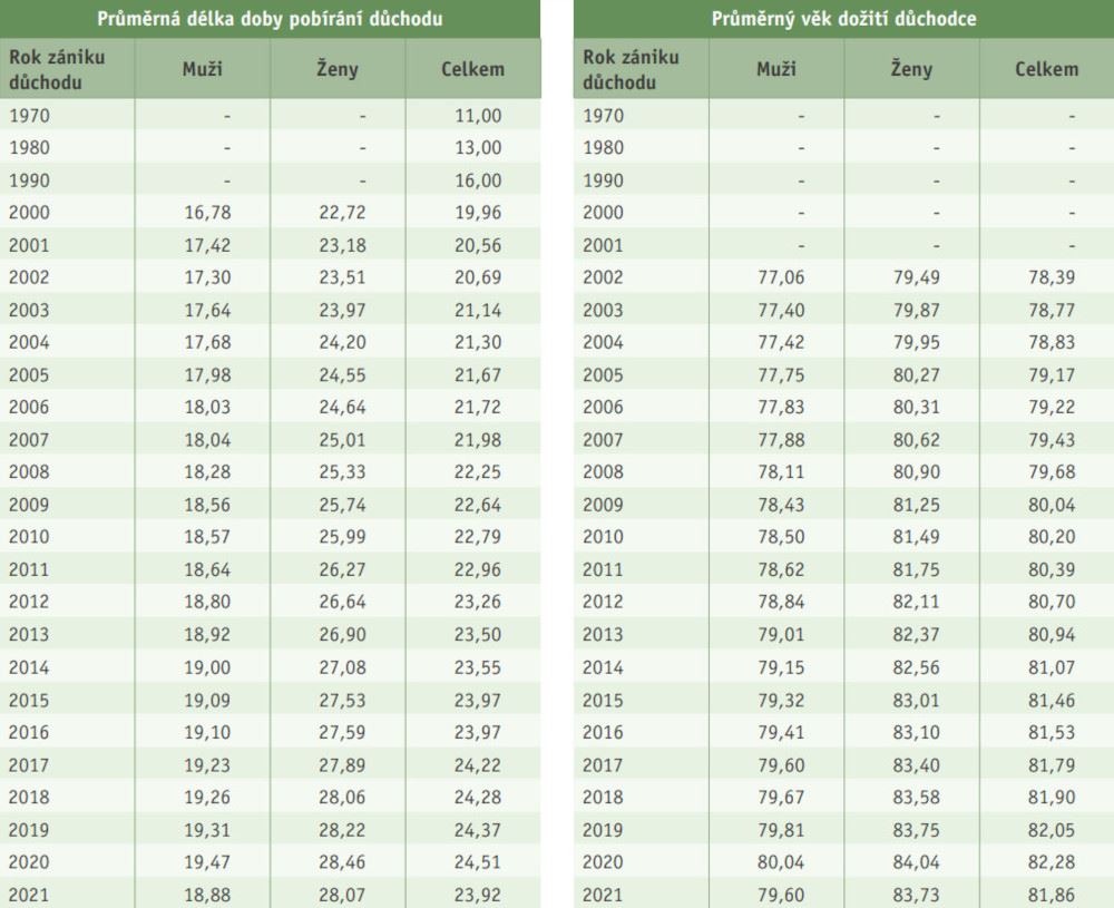 V roce 2021 dosáhla průměrná délka starobního důchodu 23,92 roku. Výrazně se ale liší podle pohlaví: Zatímco muži v důchodu stráví průměrně téměř 19 let, u žen je to 28 let.