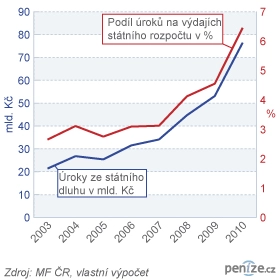 Potřebné desítky miliard bude stát posílat na úrocích investorům, kteří si koupí jeho dluhopisy. Pro letošek zchudne státní rozpočet kvůli nákladům na státní dluh o 76,4 miliardy korun, odhaduje ministerstvo financí. To je dvakrát více, než kolik stát platil před pěti lety. Ještě v roce 2007 byly výdaje na úroky z dluhu až osmou nejvyšší položkou ve státním rozpočtu. V roce 2010 to je položka číslo čtyři. Více stát vydá jen na sociální systém a na školství, vyšší je ještě kapitola všeobecná pokladní správa, z níž se platí třeba podpora stavebního spořeníči příspěvky do rozpočtu Evropské unie.