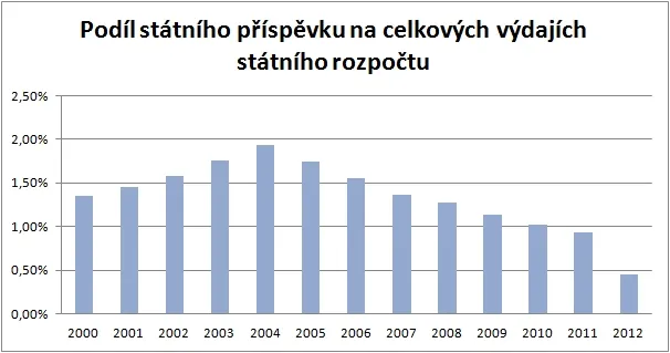 státní podpora v mld. Kč | 7,7 | 9,3 | 11,1 | 13,3 | 15,3 | 16,1 | 15,8 | 15 | 14,2 | 13,3 | 11,7 | 10,7 | 5,3 |