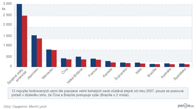 Celosvětové snížení počtu nejbohatších na 8,6 milionů lidí, o necelých 15 procent, je podle této zprávy sice méně razantní než v Česku, ale představuje pokles až pod stav v roce 2005. Ještě méně je dokonce nyní těch, jejichž čisté jmění se pohybuje nad 30 milionů dolarů. Těchto ultra bohatých ubylo o 24,6 procent. Celková hodnota majetku všech dolarových milionářů se meziročně zmenšila o 19,5 procenta na 32,8 bilionu amerických dolarů. Pokles se přitom podle ředitele pro finanční sektor společnosti Capgemini Jiřího Briforda nezastavil před žádnou částí světa: „Žádný z regionů nezůstal neposkvrněn, což ukázalo silnou ekonomickou provázanost na Zemi. Nejvýznamnější snížení velmi bohatých osob se objevilo v Severní Americe, Evropě a Asijsko-Pacifickém regionu.“ Přes padesát procent dolarových milionářů se přitom rekrutuje právě ve Spojených státech amerických, dále pak v Japonsku a Německu. Mezi země s nejbohatšími lidmi se postupně protlačuje také Čína, která už v počtu velmi bohatých lidí vloni předběhla i Velkou Británii, když před tím v roce 2007 přeskočila Francii. Podle Briforda patrně není daleko doba, kdy se Čína objeví v trojici zemí s největším počtem nejmovitějších lidí na světě.