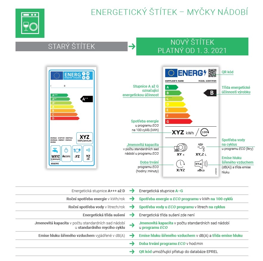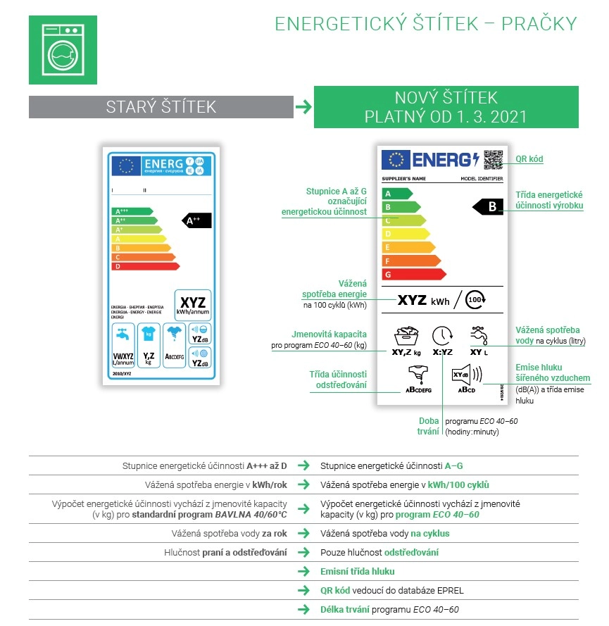 Nová stupnice má být jednotná pro všechny druhy spotřebičů. Od letošního 1. března na ni přecházejí chladničky a mrazničky, pračky a kombinované pračky se sušičkami, myčky nádobí, televizory, monitory a elektronické displeje. Obchodníci mají na náhradu starých štítků novými čas do 18. března.