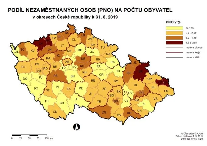 Nejvyšší podíl nezaměstnaných je v okresech Karviná (6,6 %), Ostrava - město (5,1 %), Chomutov (4,9 %), Most (4,8 %), Bruntál (4,7 %), Louny (4,3 %), Ústí nad Labem (4,2 %), Hodonín a Znojmo (oba 4,1 %). Naopak nejnižší nezaměstnanost hlásí okresy Praha – východ a Jindřichův Hradec (oba 1,2 %), Rychnov nad Kněžnou (1,3 %), Pelhřimov (1,5 %), Prachatice, Písek, Praha - západ, Plzeň - jih, Benešov a Cheb (shodně 1,6 %).